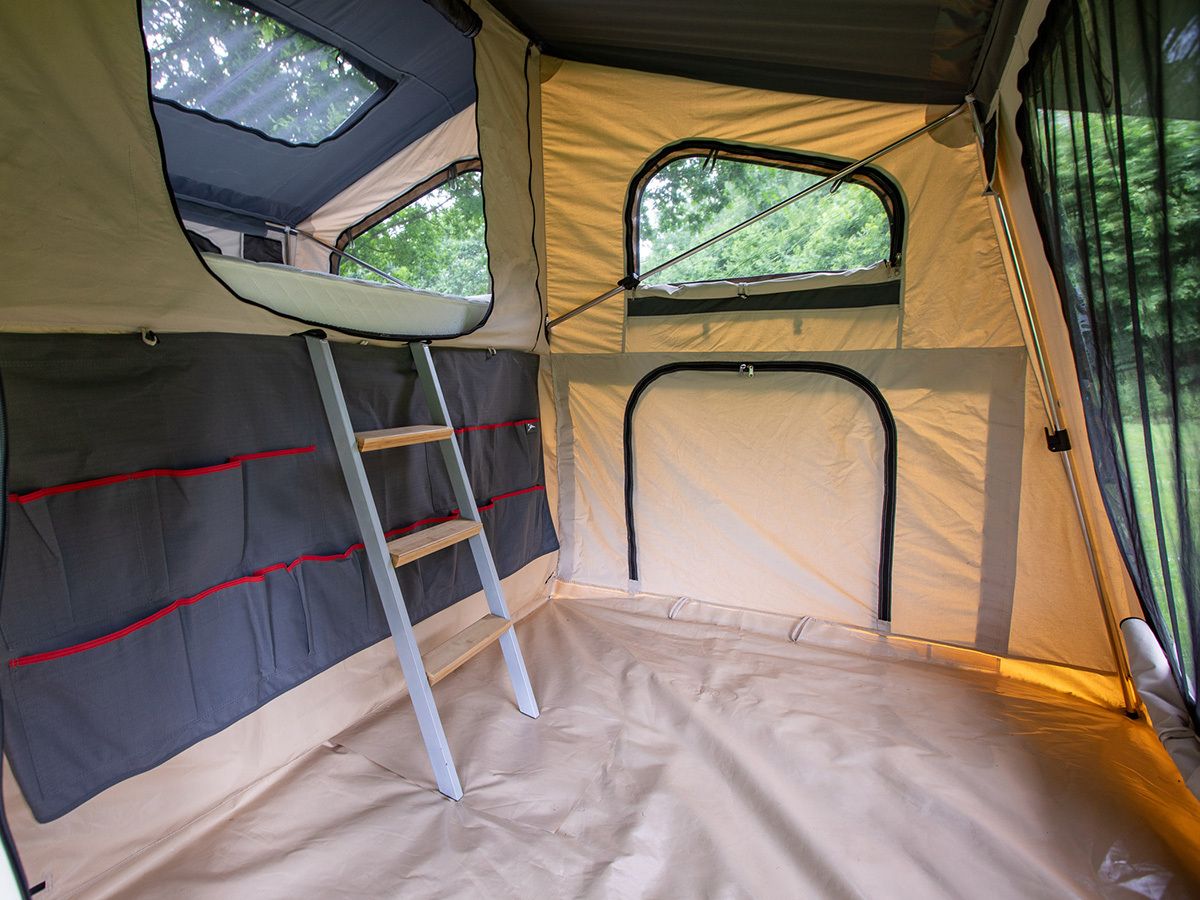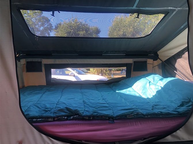 Geen gedoe met luchtbedden of krappe slaapzakken: deze vouwwagen is uitgerust met een luxe kingsize bed (210 x 170 cm). Heerlijk slapen terwijl je door het dakraam (met horrengaas tegen de muggen) de sterren ziet!